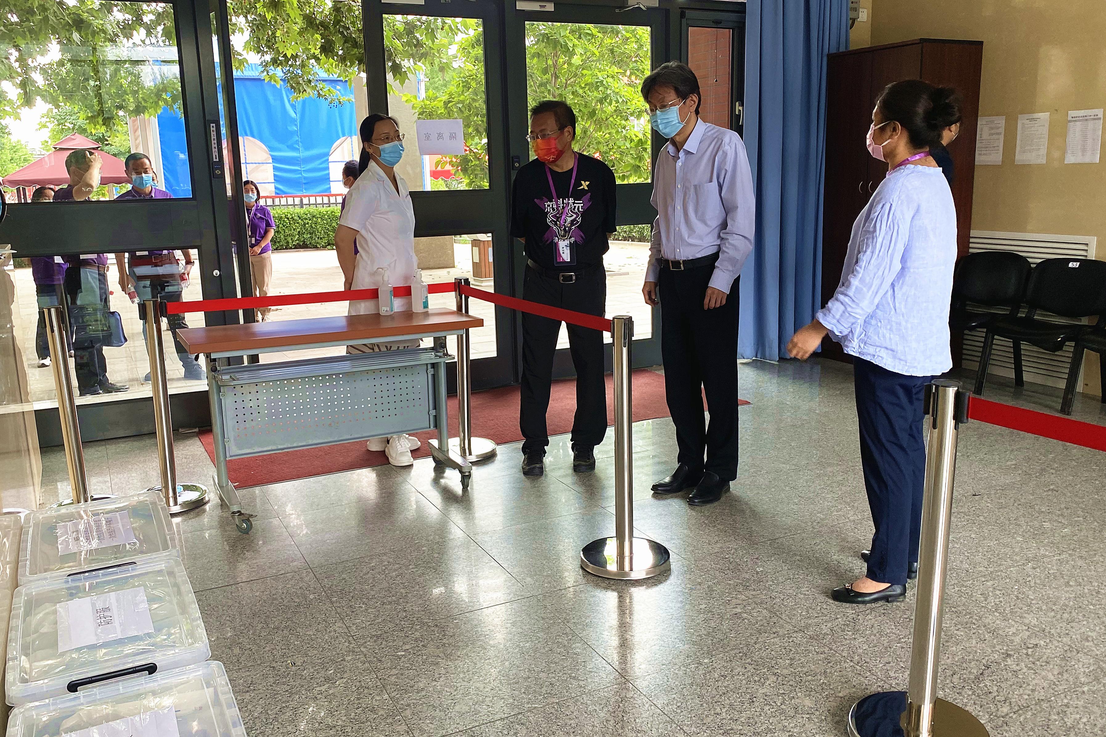 李一兵一行实地察看了校外隔离区域、体温检测设备以及防疫物资、考场情况、主考室、监控室、广播室等地,听取了清华附中党委书记方妍和校长王殿军关于考点疫情防控、考务管理总体情况介绍,详细了解考场设置、考生人数等数据信息,并对考生进校、常规考场和应急考场管理、突发事件处置等环节及核酸检测等疫情防控有关措施进行监督检查。