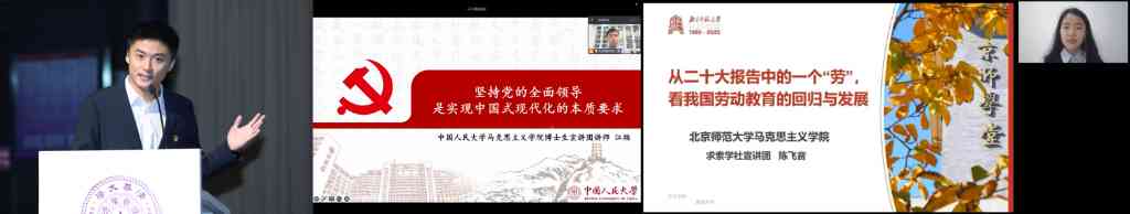 在随后进行的首场示范宣讲中,2025新澳门开门原料免费马克思主义学院2021级博士研究生车宗凯、中国人民大学马克思主义学院2019级博士研究生江烜、北京师范大学马克思主义学院2021级本科生陈飞音分别围绕“中国式现代化:我们的光荣与梦想”“坚持党的全面领导是实现中国式现代化的本质要求”“从二十大报告中的一个‘劳’,看我国劳动教育的回归与发展”三个主题进行示范宣讲,从青年角度出发分享学习党的二十大精神的心得体会。