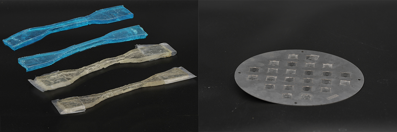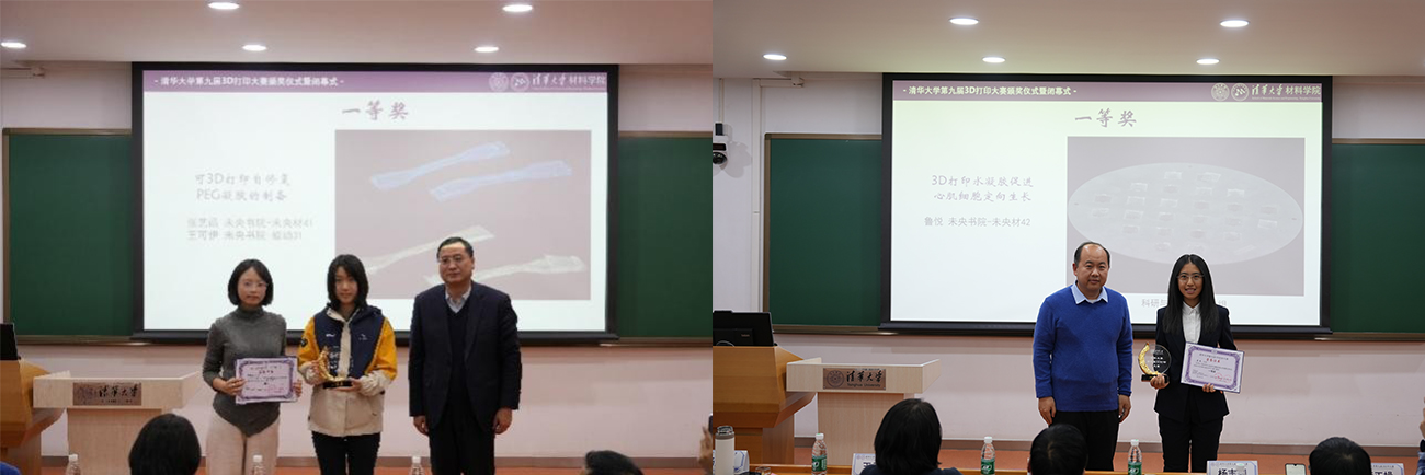 材料制备赛道获奖作品——可3D打印自修复PEG凝胶的制备(左)、科研与应用赛道获奖作品——3D打印水凝胶促进心肌细胞定向生长(右)