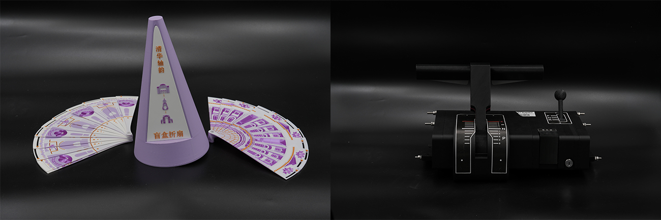 外观设计赛道获奖作品——“清华轴韵”3D打印文创折扇(左)、机械设计赛道获奖作品——基于模拟驾驶软件的电客车司控器外设(右)