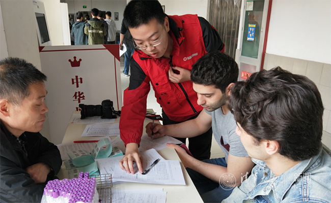 在活动现场,报名区的志愿者们手里多了一份报名表格,上面用签字笔手写了每个问题的英文翻译。而来自巴基斯坦的学生红会成员瓦卡尔(Viki),以一名普通国际学生志愿者的身份,穿上了红色的工作服,为现场的中外献血者提供热情的服务和帮助。