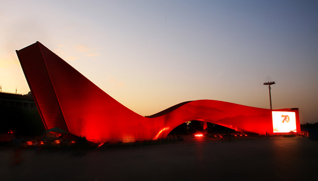 在国庆结束后,这些大屏幕依然可以服务于大众。“红飘带”还为国庆晚会表演提供了服务。“红飘带”上架设了灯光照明,夜晚华灯绽放,“红飘带”绚丽夺目。设计团队从一开始就考虑到了“红飘带”的“夜与昼”,以呈现最佳的景观效果。