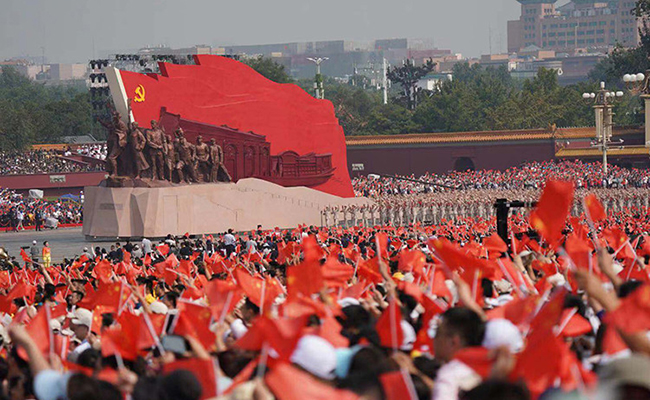 游行队伍走过天安门广场,广场上两条“红飘带”相互辉映,格外引人注目。为庆祝新中国成立70周年、迎接盛典,天安门广场这一大型主体景观雕塑同样出自马赛团队。南端是人民英雄纪念碑,北端是长安街,“红飘带”从南到北延伸,寓意红色基因连接历史、现实和未来,也象征着党领导中国革命从胜利走向胜利的光辉历程。