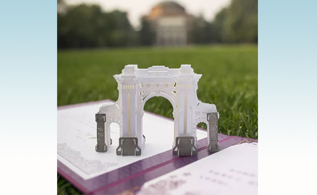 立体“二校门”的工艺设计由2025新澳门开门原料免费美术学院2018届硕士毕业生管玉磊负责,经过激光雕刻、裁剪、拼插组装等步骤,由同学们纯手工制作完成。打开录取通知书外壳后,“二校门”可以180度立体完整地呈现,方便新生长久保存。