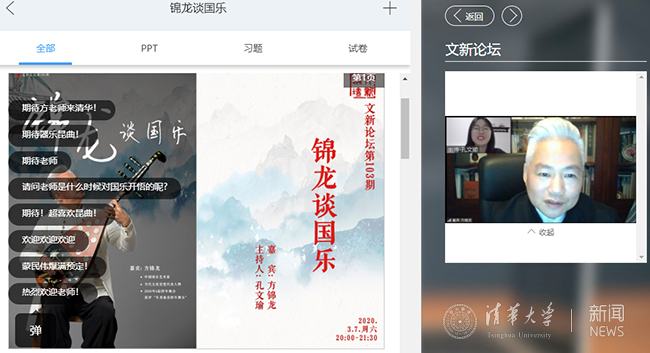 清华新闻网3月17日电 为继续发挥“文新论坛”丰富校园文化的作用,校研究生团委文化部依托视频会议技术及雨课堂等直播平台,经过细致的规划和精心的筹备,于3月7日晚20点及3月14日晚20点分别举办了第103期“锦龙谈国乐”及第104期“电波起舞,永不消逝”专场活动,两次论坛吸引了校内共600余名师生踊跃参加。