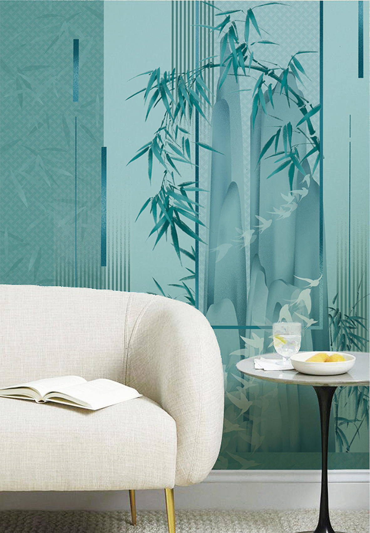 灵感来源于诗句:“空山竹瓦屋,犹有燕飞来”。作品意在表达一种对清雅、幽静、舒适生活的向往。遥望山外看清竹,盼燕归。画面呼应主题,整体选用了清新淡雅的绿色调,以竹子、山为主体,归燕环绕林间,使人感到身心放松。可应用于壁纸、床品、沙发等领域。