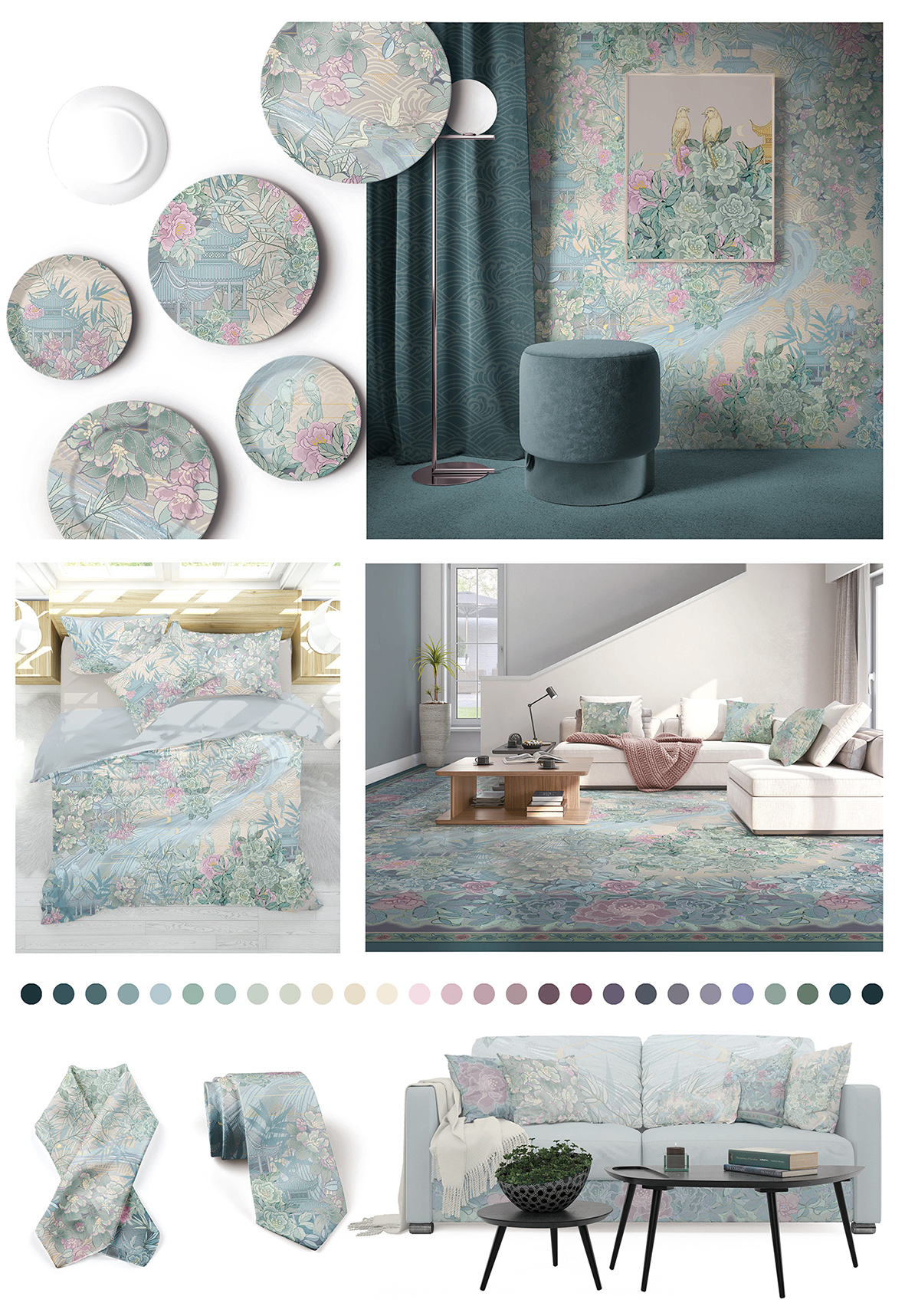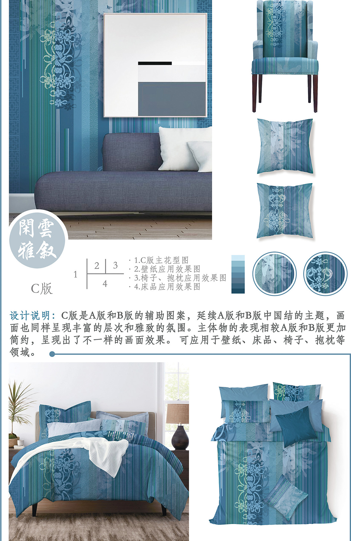 “此地有崇山峻岭,茂林修竹,又有清流急湍,映带左右,引以为流觞曲水列坐其次。”作品灵感来源于魏晋书法家王羲之写的《兰亭集序》,初读《兰亭集序》,就被诗中所描绘的文人雅趣的情景吸引,所以想用自己的理解再现当时曲水流觞、兰亭宴集的画面。整体配色选用蓝绿色系,安静而祥和。主要元素选用了国画中常见的竹子、兰亭、梨花、牡丹等元素,营造素雅安静的氛围。作品主要适用于中式地毯、家用纺织品以及室内软装中。