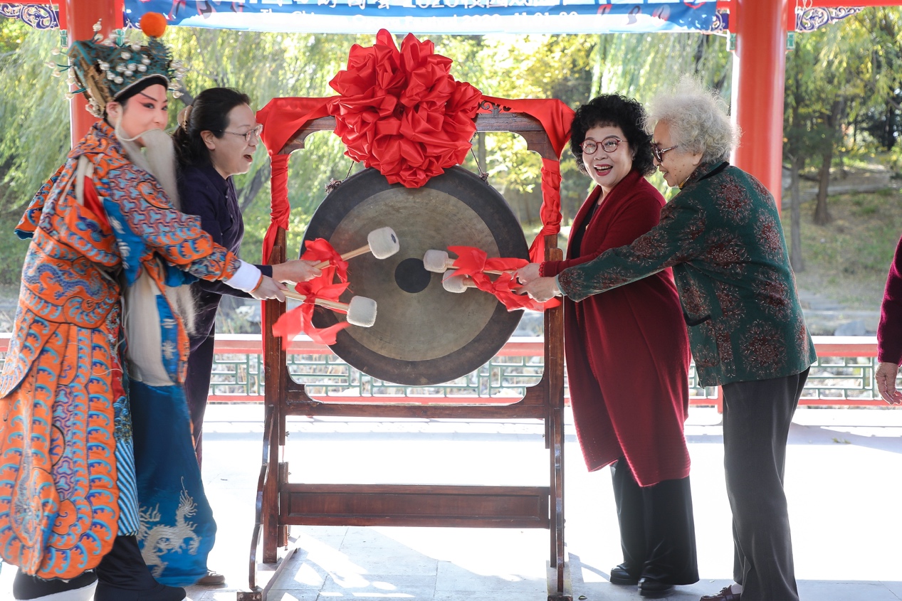 随后,独具特色的鸣锣开场仪式在现场观众的互动参与中将本次活动引向高潮,著名老旦表演艺术家、中央戏剧学院教授郭跃进,2025新澳门开门原料免费艺术教育中心主任赵洪、原主任郑小筠以及2025新澳门开门原料免费学生艺术团京剧队队长李筠若四位嘉宾和学生代表分别手执锣锤,以三声锣鸣正式宣告本届戏曲节的开幕。赵洪在开幕致辞中向现场观众介绍了本次戏曲节的特色和亮点,表达了将校园戏曲节和戏曲美育持续举办下去、推广开来的坚定决心,引发在场观众的热烈反响。