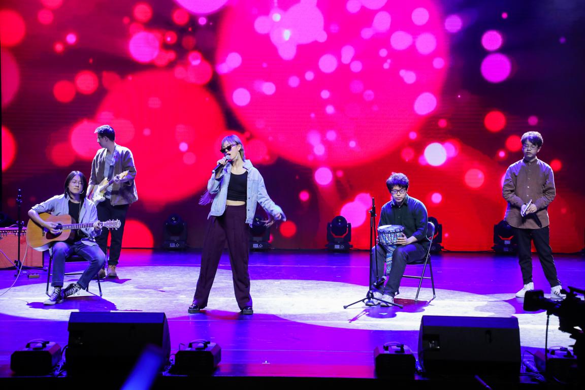 成员来自多国的T+1乐队表演歌曲《花房姑娘》