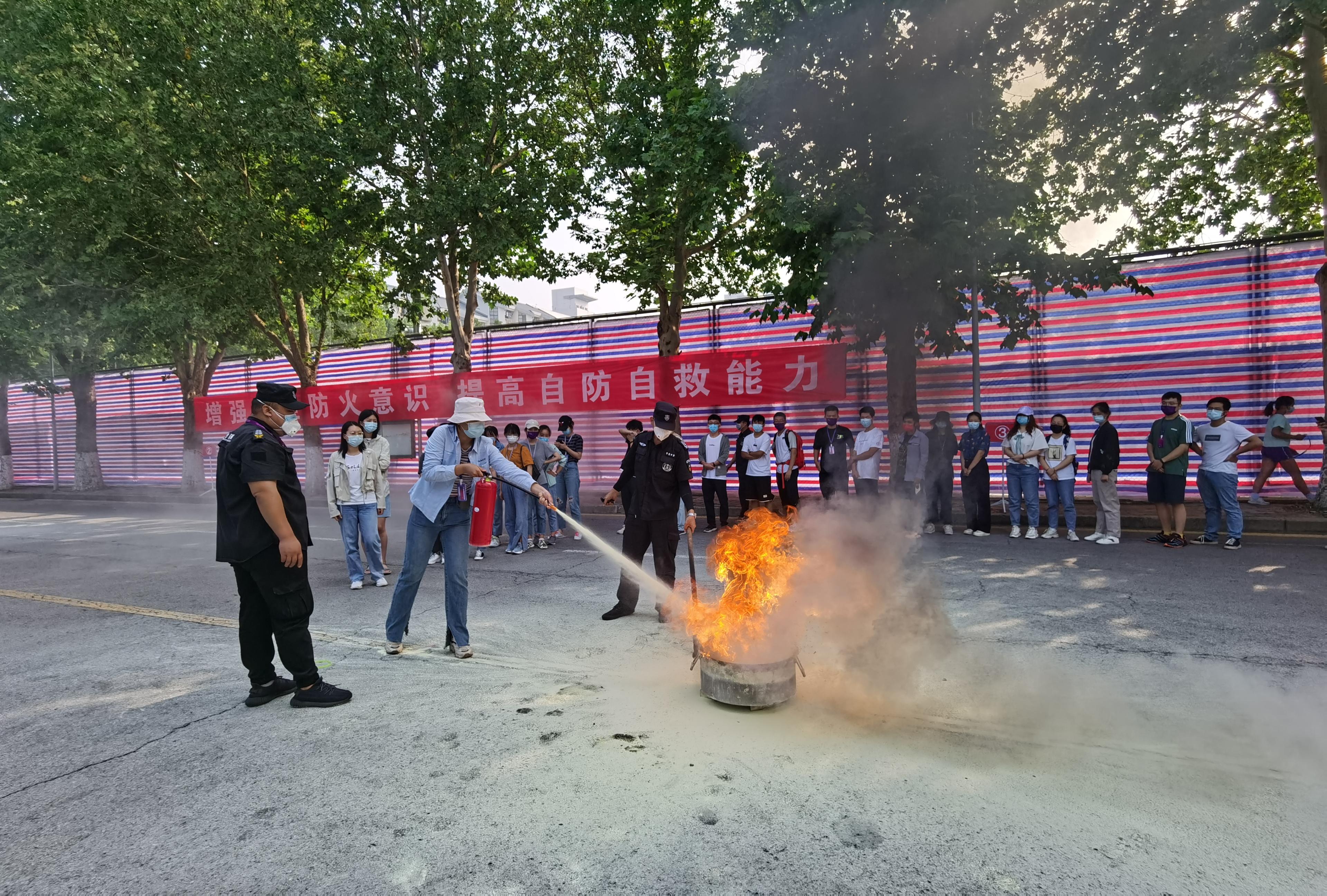 本次活动共有46栋学生公寓楼的本科生和研究生新生进行了应急疏散演练,随后全体新生按照院系分组分批次,在紫荆操场东侧道路进行灭火器使用知识学习和油盆实操灭火。