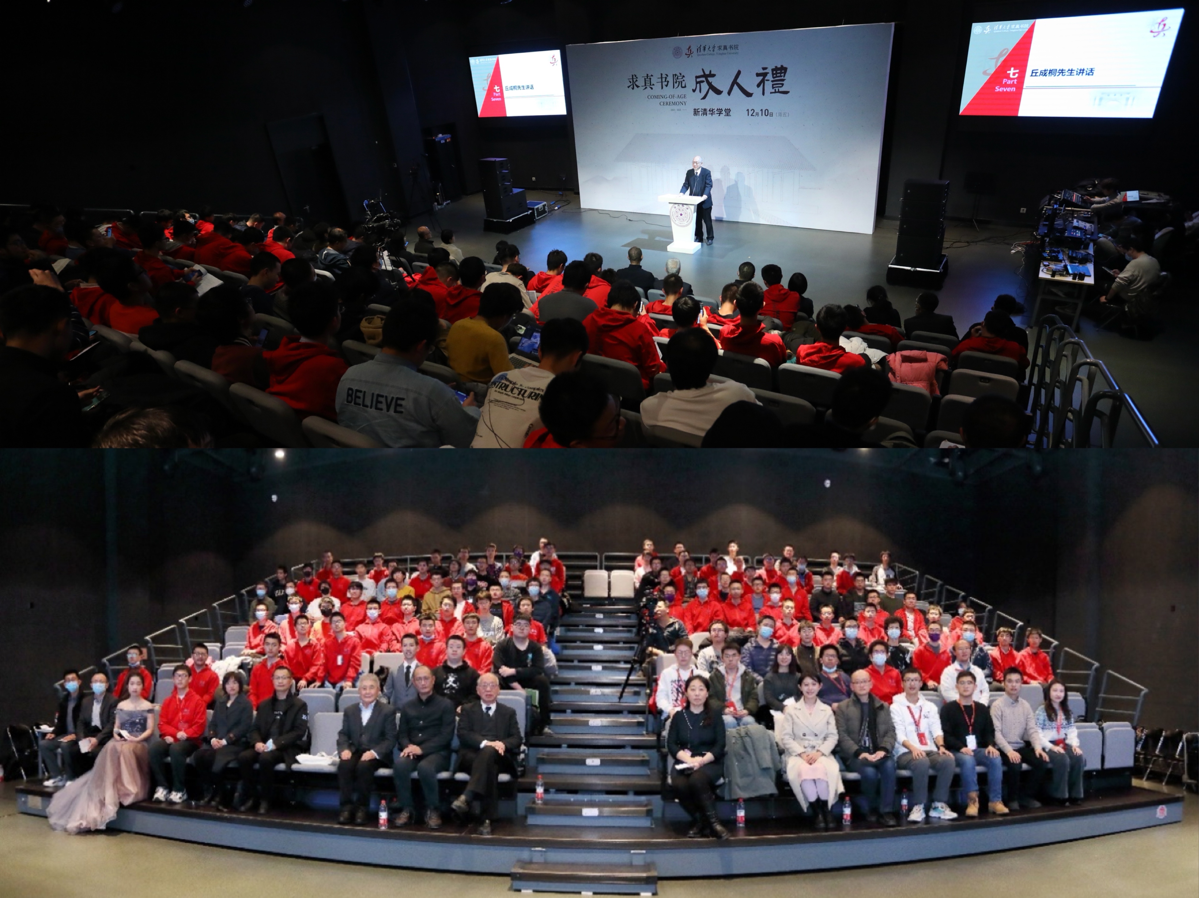 清华新闻网12月15日电 12月10日下午,求真书院首届“成人礼”在新清华学堂实验剧场成功举行。求真书院院长丘成桐,中国工程院院士、机械系教授王玉明,中央美术学院教授邱志杰,书院管理中心主任苏芃、副主任朱德军,求真书院副院长、书院管理中心副主任王小芳,中国经学研究院副研究员张涛,以及求真书院益友学者、辅导员和全体大一学生参加活动。学生家长在线参与活动。